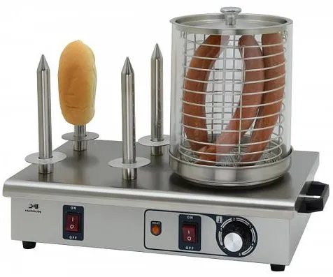 Аппарат для хот догов Hurakan предназначен для отваривания сосисок и подогрева булочек. Модель оснащена паровой баней для варки и хранения в горячем виде сосисок, а также четырьмя нагреваемыми штырями для подогрева булочек изнутри. Идеально подходят для оснащения уличных точек и заведений быстрого питания.