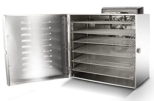 550*425*375мм, 11кг, 220В, 0.4кВт, 10 уровней, 10 решеток в комплекте,размер решеток 380*280мм, расстояние между решетками 46мм, температура 30-90C, таймер, материал корпуса и решеток нерж. сталь