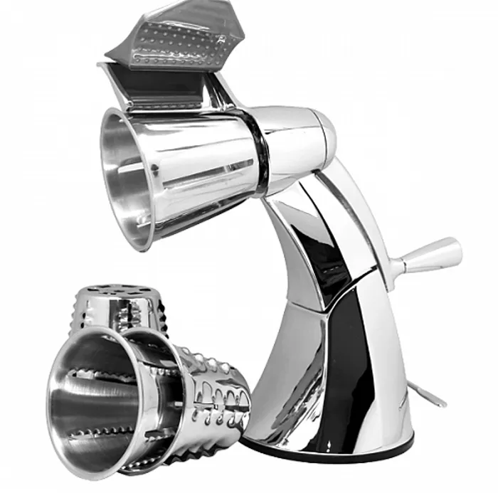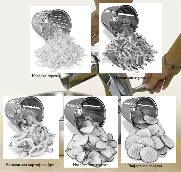 360x270x280, 4.67кг, ручной привод, крепится к столу на присоске, 5 насадок в комплекте (шредер, мелкая ломтерезка, для картофеля фри, средняя ломтерезка, вафельная насадка)Характеристики