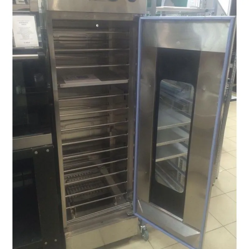 500x700x2010мм (высота без колес 1940мм), 48кг, 220В, 2,6кВт, 16 уровней, влажность 80-95%, температурный режим 30-110C, нерж.сталь, плавная регулировка температуры, 2 регулировки температуры - для влажного и сухого нагрева, высота между направляющими 9,4см, вентилируемый, можно использовать противни 600х400мм и гастроемкости GN 1/1