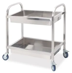Тележка для посуды Hurakan HKN-TCD2 предназначена для сервировки обеденных залов, а также для сбора и перевозки грязной посуды. Модель оснащена 2 полками и 4 поворотными колесами. Выполнена из нержавеющей стали.