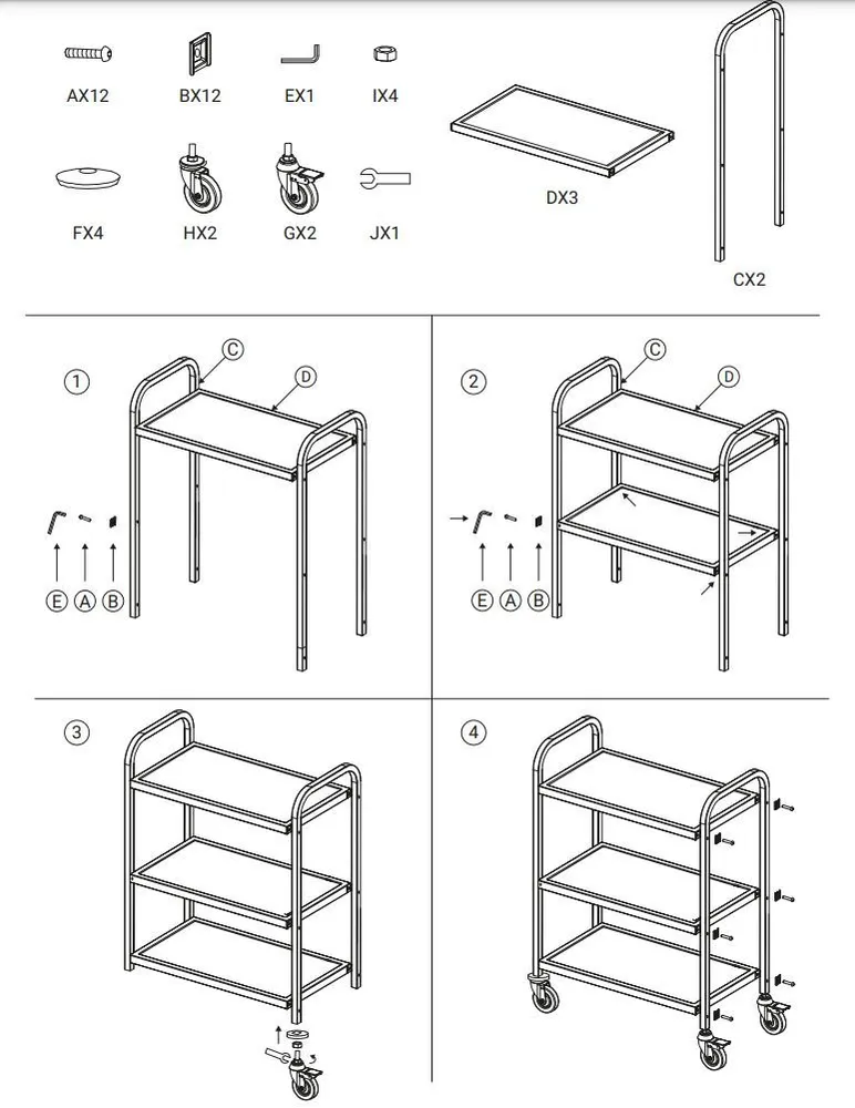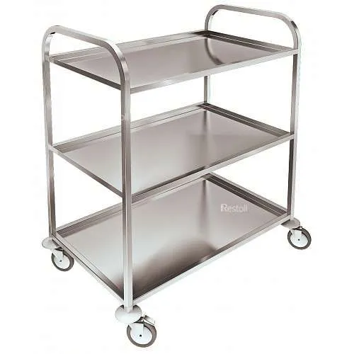850х450х900мм, 12,3кг, сталь 201, каркас разборный из трубы 25,4х25,4мм, 3 полки, расстояние между полками 24см, 4 колёса (2 колеса со стопором), макс. суммарная загрузка 45кгХарактеристики